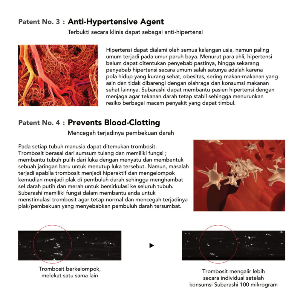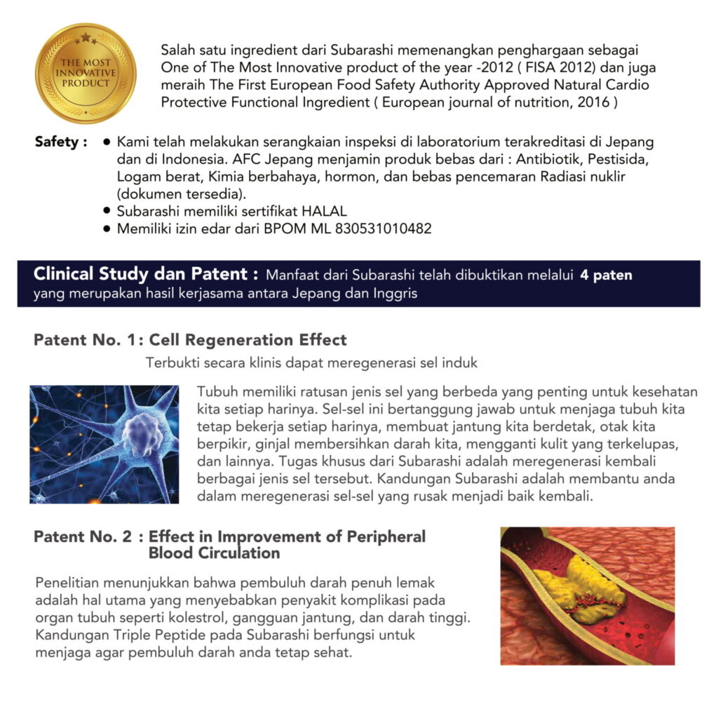 Terbuat dari bahan-bahan alami. 6 Bahan utamanya antara lain : Salmon Ovary Peptide, Sardine Peptide, Salmon Anserine Peptide, Salmon Caviar Peptide, Tuna Heart Peptide dan Fruitflow. SOP Subarashi memiliki 8 paten manfaat, seperti yang tertera pada gambar di bawah ini :